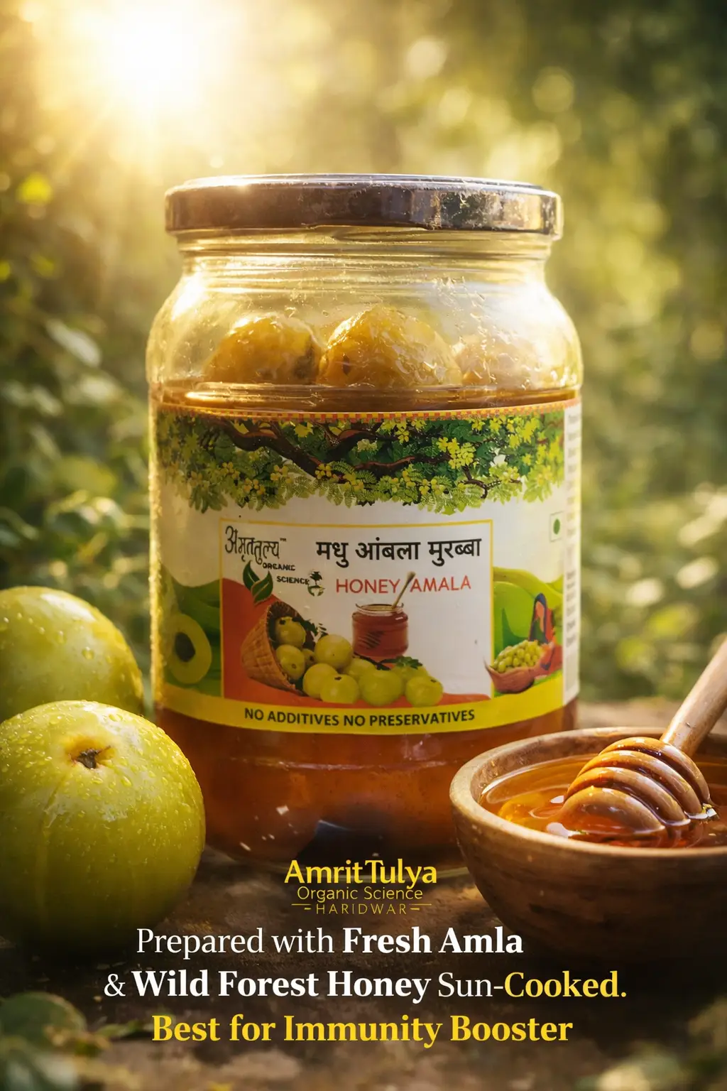 Honey Amla Murabba is a traditional Ayurvedic preserve made from fresh, whole amla (Indian gooseberry) gently cooked and naturally sweetened with pure honey instead of refined sugar. This careful preparation helps retain Amla’s natural vitamin C, minerals, and antioxidants, delivering both taste and wellness in every spoon.
