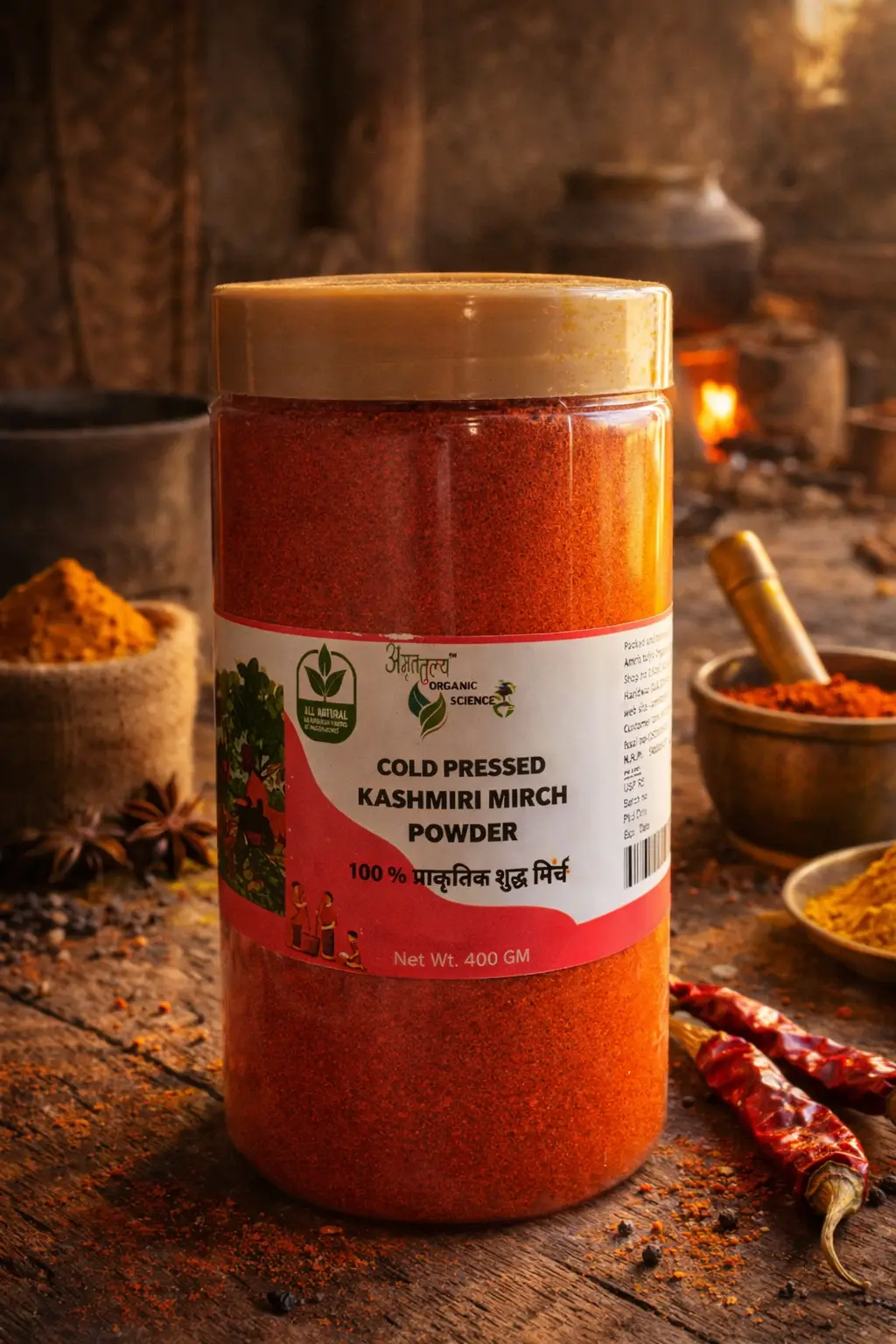Kashmiri Lal Mirch is a premium red chilli powder known for its bright natural red colour and mild pungency. Our Kashmiri Lal Mirch is cold-pressed and hand-grounded using traditional methods, which helps preserve its natural oils, rich aroma, and authentic flavour.